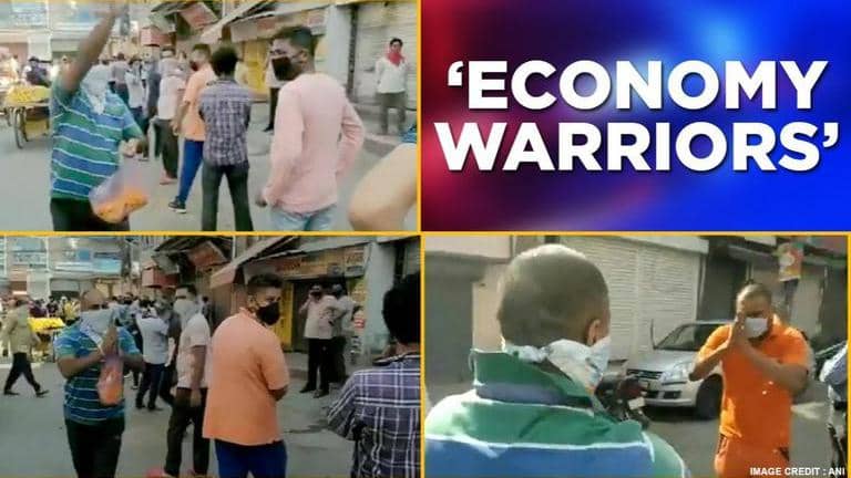#WATCH Delhi: A man showers flower petals on people standing in queue outside liquor shops in Chander Nagar area of Delhi. The man says, "You are the economy of our country, government does not have any money". #CoronaLockdown pic.twitter.com/CISdu2V86V