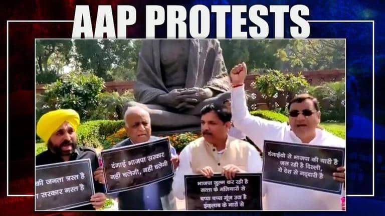 AAP MPs Sanjay Singh, Bhagwant Mann, N D Gupta, and Sushil Gupta staged a protest in front of the Mahatma Gandhi statue in the Parliament complex. The protest comes on the same day when Delhi Chief Minister Arvind Kejriwal met with Prime minister Modi, and two leaders discussed the situation in the riot-hit part of Delhi.