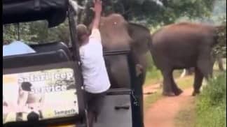 An X user posted the video. There is a herd of elephants nearby and a group of tourists in a car are visible in the footage, which looks to be from a wildlife sanctuary. Suddenly, one of the elephants loses his cool and rushes in the direction of the car. One of the men—possibly the tour guide—opens the door, thumps the car's bonnet to frighten the elephant away, and then just raises his hand, which causes the elephant to stop and turn away in the direction of the herd.