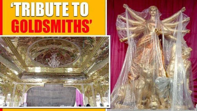 As Durga Puja knocks at the door of every household in Bengal and the world over, organisers of Santosh Mitra Square Durga puja committee in Kolkata are using 50-kilogram gold sheets to adorn goddess Durga, her lion, and Mahishasura. The value of the gold used is worth Rs 20 crore and the makers expect that such a feast for the eyes is bound to allure puja revelers to the Santosh Mitra Square Puja marquee. The 13-feet tall Durga idol will be covered with sheets of pure gold from head to toe. Santosh Mitra Square is situated close to the city's famous Jewellers' hub, Bowbazar.