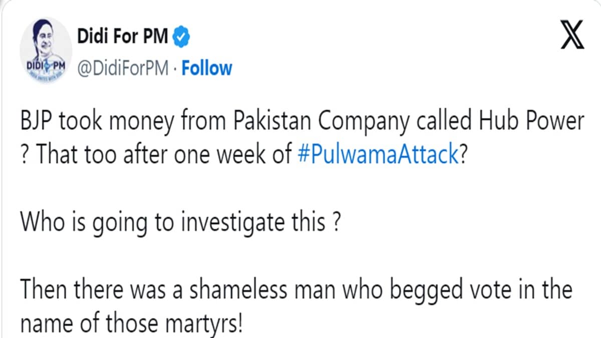 An X account endorsing TMC supremo Mamata Banerjee as Prime Minister, wrote, “BJP took money from Pakistan Company called Hub Power ? That too after one week of #PulwamaAttack? Who is going to investigate this? Then there was a shameless man who begged vote in the name of those martyrs! #ElectoralBondScam #AnswerNowModi”