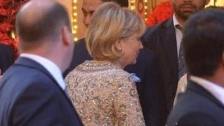 Former US first lady Hillary Clinton who came to India to attend the wedding celebrations was also spotted arriving at the Ambani residence in Mumbai.