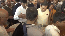 Gautam Adani along with his wife Priti Adani distributes food to people at the camp of ISKCON Temple.