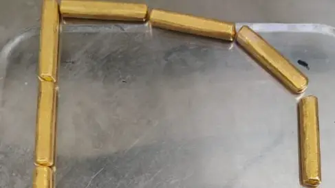 12 yellow metal rods, weighing 419 grams, suspected to be gold, concealed within the wheels of the passenger's trolley bag were recovered from his possession.