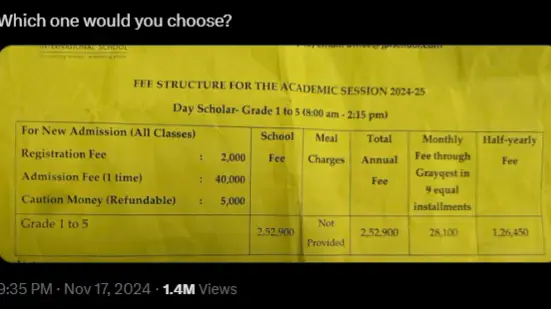 In this viral post man shares, “My daughter will start Grade 1 next year, and this is the fee structure of one of the schools we are considering in our city. Note that other good schools also have similar fees.”