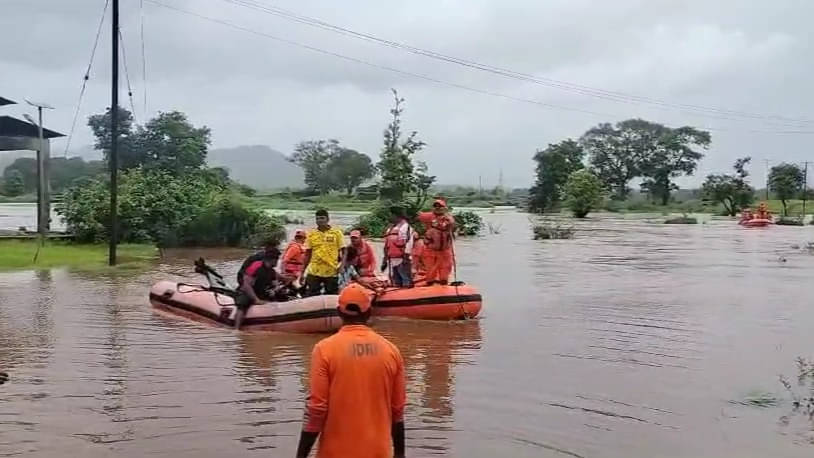 Thane: Amid heavy downpour in Maharashtra's Thane and Palghar, the National Disaster Response Force (NDRF), on Sunday, rescued 49 people from a water-logged resort in Thane and 16 villagers in Palghar. The NDRF team used boats and life jackets to rescue people stranded at the resort due to flooding in the Shahpur area, an official said.