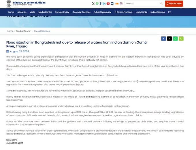 Flood situation in Bangladesh not due to release of waters from Indian dam on Gumti River, Tripura say MEA in a statement.