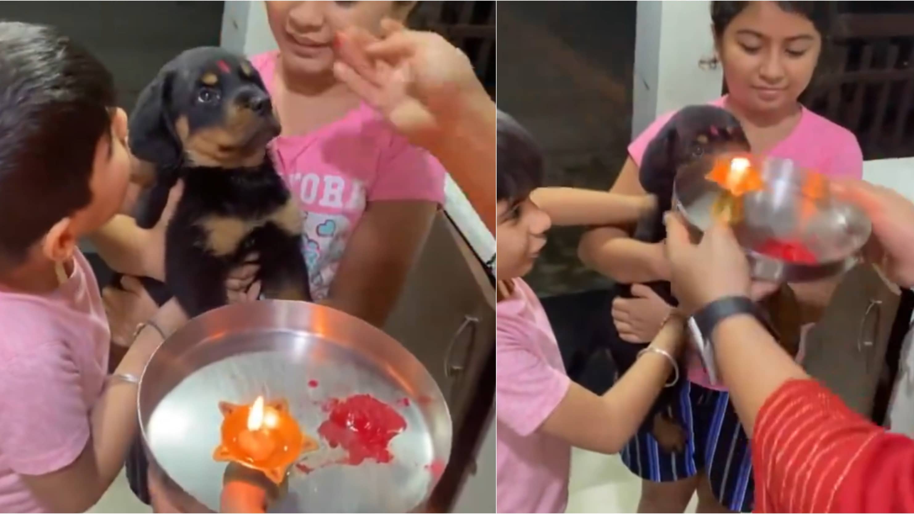 The viral video shows two kids—a young boy and a girl—in one frame. The girl is holding a black puppy in her arms. Both boys and girls enter the house, where a woman performs Aarti rituals to welcome the new family member. The woman also applies tilak to the puppy's forehead.