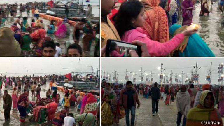 Prayagraj: Devotees take holy dip at Sangam on #MaghiPurnima pic.twitter.com/6gHb0YWb8t