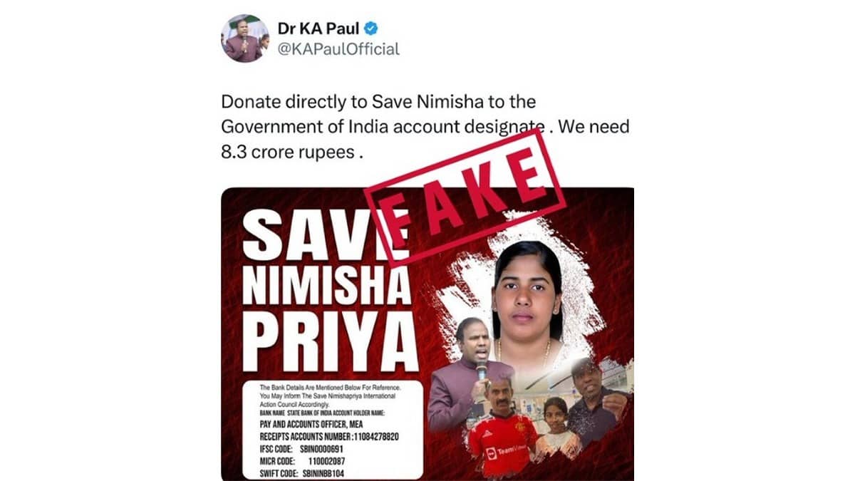 Refuting the false claim, the MEA Fact Check stated, "We have seen claims on social media seeking monetary contributions into a Government of India-designated bank account in the Nimisha Priya case. This is a fake claim."