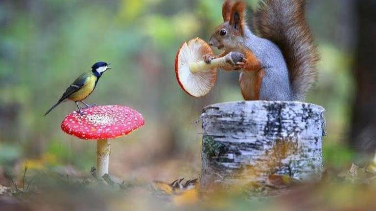 A squirrel and a bird having conversation over a mushroom. This picture by Vadim Trunov is so soothing. Like from other world !! Isn't it. pic.twitter.com/8iTHl2GhOi