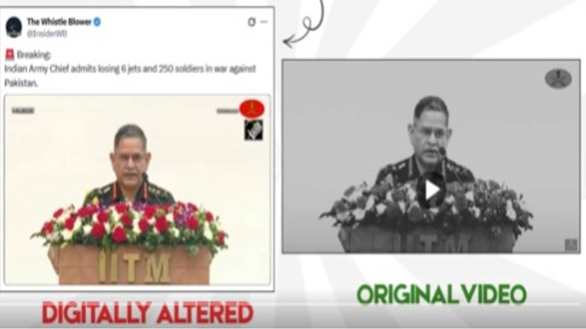 The fake video was shared by an X account named "The Whistle Blower" with the caption, "Breaking: Indian Army Chief admits losing 6 jets and 250 soldiers in war against Pakistan."