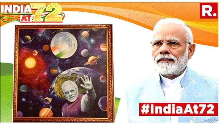 The portrait displays the Prime Minister waving his hand with the Earth in the background. The moon is also depicted close to the Earth, with a hint of the Tricolour implying the impending arrival of Chandrayaan-2 at the lunar surface. Other planets resembling Saturn, Jupiter, Neptune, Mars, and the Sun are seen in the starry violet background.
