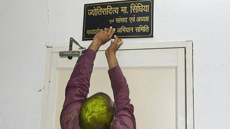 A day after Jyotiraditya Scindia resigned from the primary membership of the Congress party, his nameplate was removed from the Congress office in Bhopal. The nameplate read, 'Jyotiraditya Scindia, former MP, and head.'