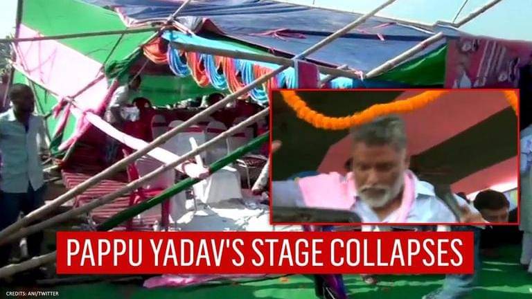 After the stage collapsing fiascos of Congress leaders amid their rallies in Bihar, another similar incident took place on Saturday in Muzaffarpur, this time with Jan Adhikari Party leader Pappu Yadav who was addressing the crowd when the tent and the platform on which Yadav stood collapsed, taking him down. After the incident, it took a couple of persons to get him back on his feet as can be seen from the video, while the photos below show the extent of damage to the tent setting after the collapse.