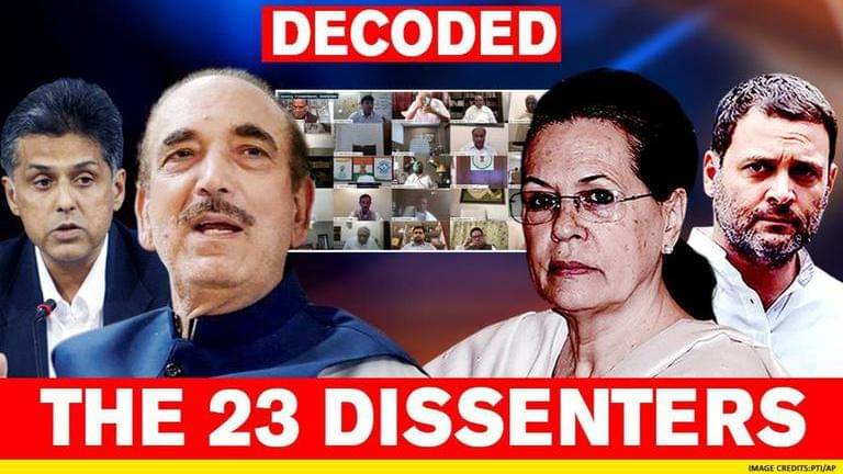 The 23 Congress leaders who wrote the 'letter of dissent' are - Rajya Sabha MP Ghulam Nabi Azad, Anand Sharma, Kapil Sibal, Manish Tewari, Shashi Tharoor, Vivek Tankha, Marpadi Veerappa Moily, Mukul Wasnik, Jitin Prasada, Bhupinder Singh Hooda, Rajinder Kaur Bhattal, Prithviraj Chavan,  PJ Kurian, Ajay Singh, Renuka Chaudhary, Milind Deora, Sandeep Dixit, Raj Babbar (UP), Arvinder Singh Lovely (Delhi), Kaul Singh Thakur (Himachal Pradesh), Akhilesh Prasad Singh (Bihar), former Haryana Speaker Kuldeep Sharma and former Delhi Speaker Yoganand Shastri.