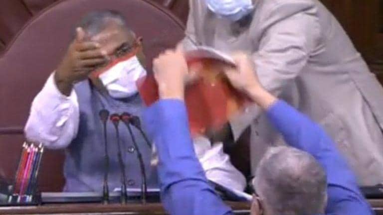 Rajya Sabha: TMC MP Derek O'Brien entered the well and showed the House rule book to Rajya Sabha Deputy Chairman Harivansh, during discussion in the House on agriculture Bills pic.twitter.com/OlTjJb6j4F