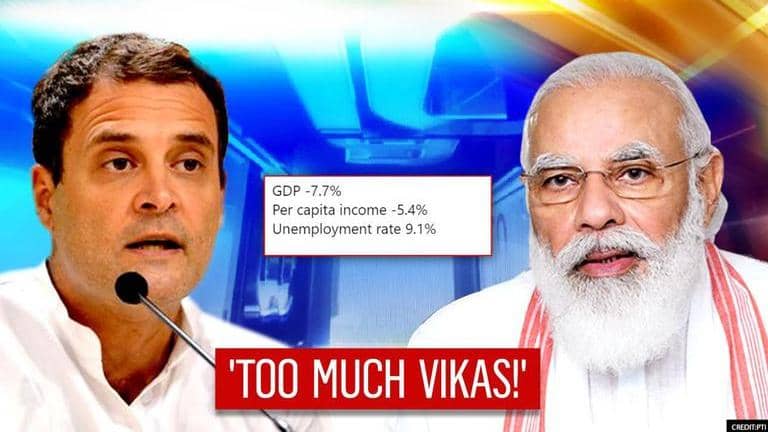 Congress leader Rahul Gandhi on Saturday took a dig at the Narendra Modi government over revised estimates which indicate that the Indian economy could contract by 7.7% in the current financial year, with an unemployment rate of 9.1 percent. Mocking the BJP government's "Sabka Sath Sabka Vikaas" motto, Gandhi said the figures indicated “too much vikas” (development) of the country.