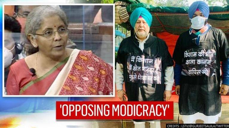 Two Congress MPs from Punjab wore a black gown to the Parliament on Monday, as a mark of their protest against Centre's farm laws and in support of the farmers protesting at Delhi borders for over two months. Congress MPs Jasbir Singh Gill and Gurjeet Singh Aujla wore a black gown to the Parliament on the day when Finance Minister Nirmala Sitharaman is presenting Union Budget 2021-22 in Parliament.