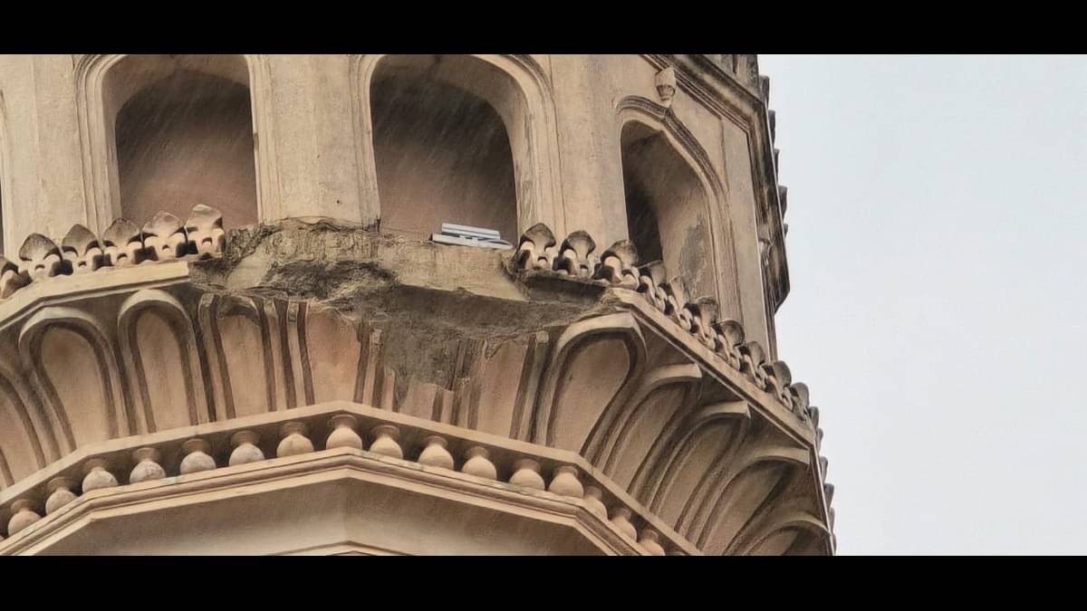 New Delhi: A small portion of the northeast minaret of Hyderabad’s iconic Charminar chipped off during heavy rainfall that lashed the city on Thursday afternoon. Visuals of the damage showed that a part of the historic monument had fallen while it was pouring.