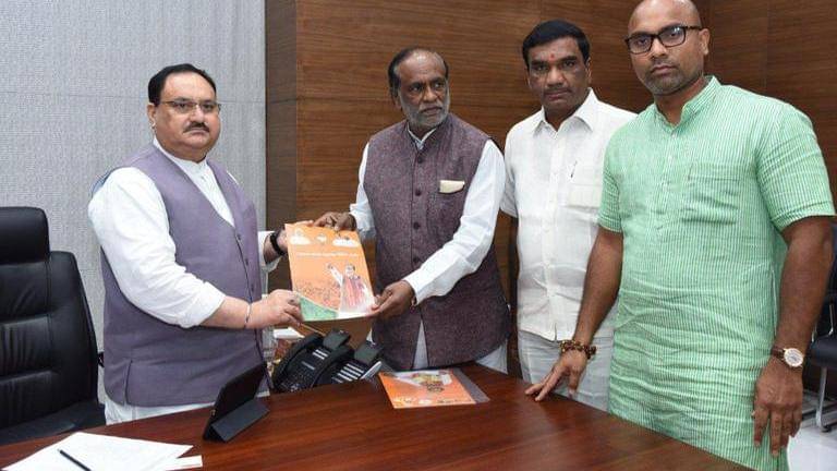 BJP president of Telangana K Laxman on Saturday met BJP working president JP Nadda in Delhi and submitted a report over the ongoing strike of Telangana State Road Transport Corporation (TSRTC) employees. Laxman took to Twitter to share the update and wrote, "Submitted a brief report to BJP National Working President JP Nadda, on the ongoing TSRTC Strike and updated about the current political situation in Telangana."