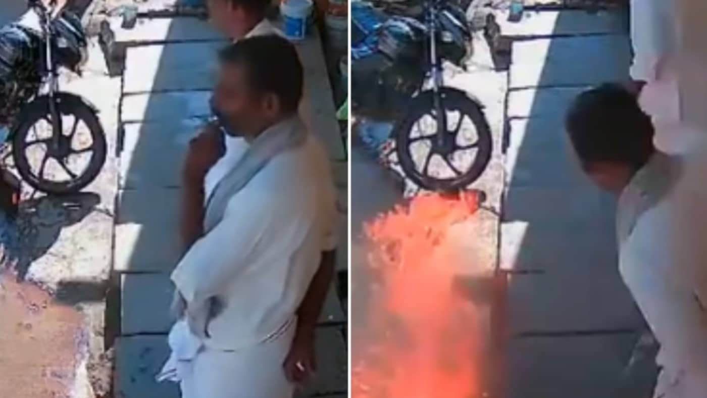 The video that has now gone viral shows two men standing and chatting near one of the shops. The footage reveals that a stream of petrol had pooled on the road in front of them, but the men seemed unaware of the potential hazard. As they continued their conversation, one of the men decided to light a beedi. After lighting it, he carelessly discarded the still-burning matchstick into the pool of petrol.