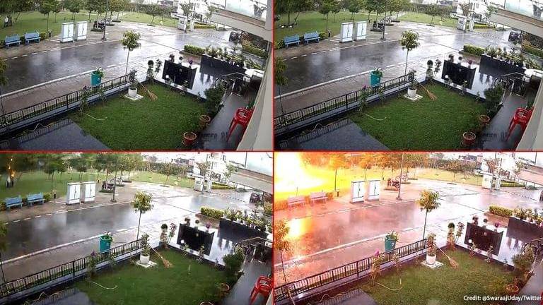 The four men fell on the ground within seconds after lightning hit the tree and they were immediately taken to a private hospital in Manesar. One person succumbed to injuries while three others are undergoing treatment for burn injuries in the hospital. The video of the incident was captured in CCTV cameras. Take a look at the video.