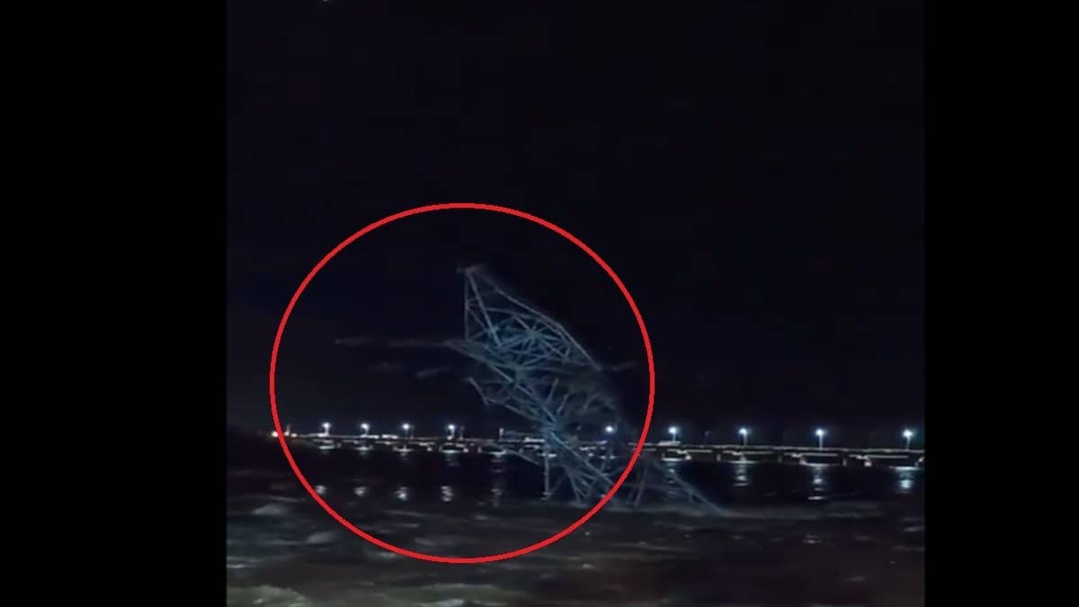 Tiruchirappalli, Tamil Nadu: A video has been going viral on social media where a high-tension tower situated in the middle of a river can be seen tilting dangerously and is on the verge of sinking following heavy rainfall. The incident occurred on Thursday night, with the river’s water levels rising above the danger mark.