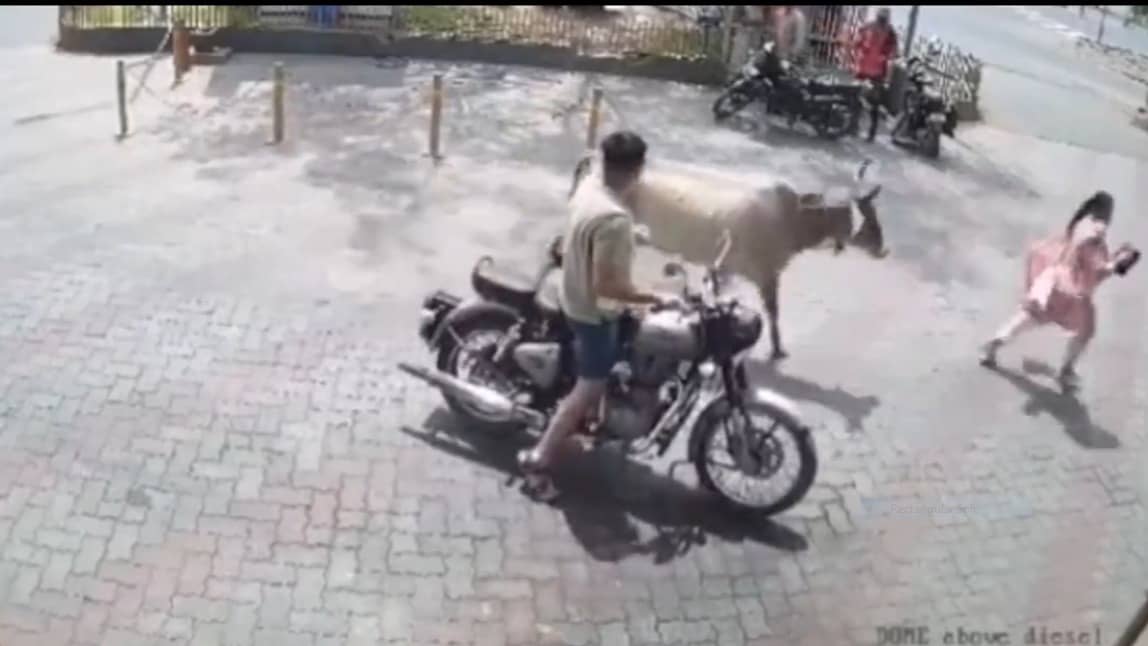 In the 42-second-long video, the stray animal can be seen inching towards a couple on their bike near a petrol pump in Modasa. As the cow attacked at the woman, she got off the motorcycle and started running to save her life. However, the cow chased her down and started striking her repeatedly as she fell down and shouted for help. Though the woman’s husband tried everything to stop the cow, the assault only ended when an employee from the nearby petrol pump came running with a stick and chased the cow away. The sudden attack by the cow made everyone present at the scene run hastily to save their lives.