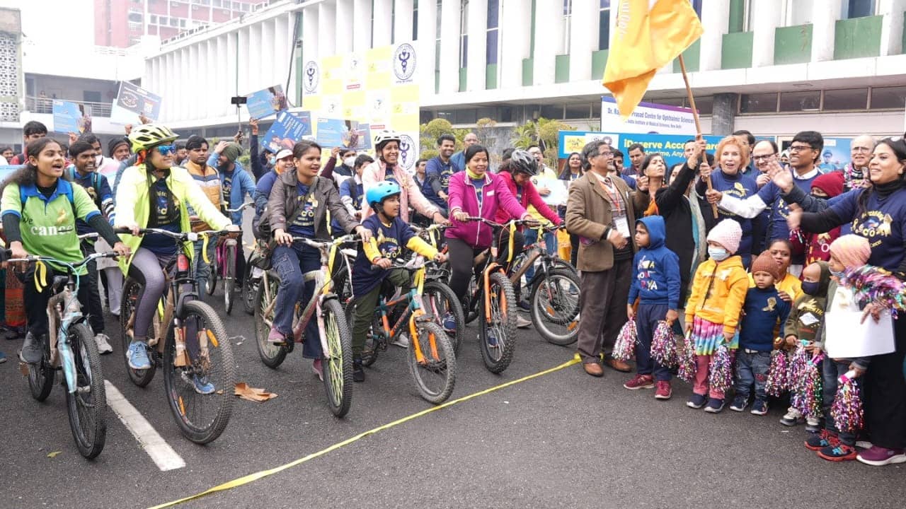 New Delhi: The theme of the cycle rally, flagged off by AIIMS director Dr M Srinivas on World Cancer Day on Sunday, resonated with ‘Pushing the Pedal for Cancer survivors.’ The cycling marathon, titled 'Cycleforgold,' took place at AIIMS in New Delhi, aiming to raise awareness, address challenges in accessing care, and garner support from society for the treatment and care of children with cancer.