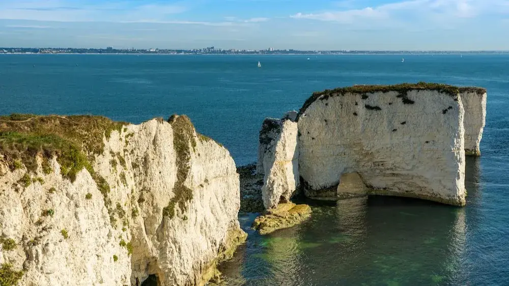 Old Harry Rocks are about 60 million years old, from the Cretaceous Age. Erosion has taken away a big part of them over time. The small stump, called 'the wife,' is only visible during low tides. The two big rocks are now a UNESCO Heritage Site, made of chalk and changing their shape each year due to the waves.
