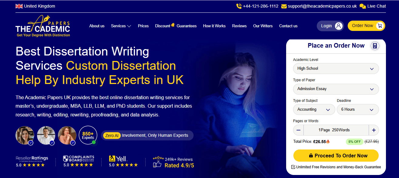 After thoroughly testing 10 websites, we have discovered that The Academic Papers UK, Affordable Dissertation UK, and Cheap Essay Writing UK all offer the best dissertation writing services in the United Kingdom. Whether you need in-depth research, budget-friendly pricing, or urgent delivery, these services offer solutions that align perfectly with your academic requirements.