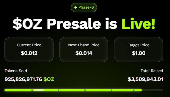 In 2025, one project is emerging as the focal point of that conversation: Ozak AI (OZ). Priced at just $0.012 in its 6th presale stage, with over $3.5 million raised and 925 million tokens sold, Ozak AI is giving investors the chance to test the “small entry, big fortune” formula once again.