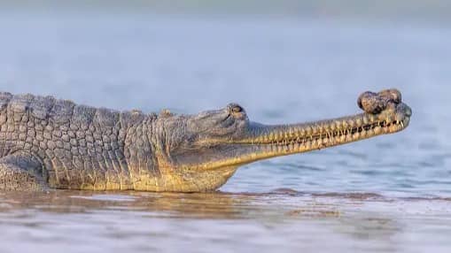 It's a fish-eating crocodile that has a long, narrow snout, is native to the rivers of northern India. The gharial's unique jawline is adapted to catch fish, its primary diet. Habitat destruction and fishing nets have contributed to its critically endangered status.