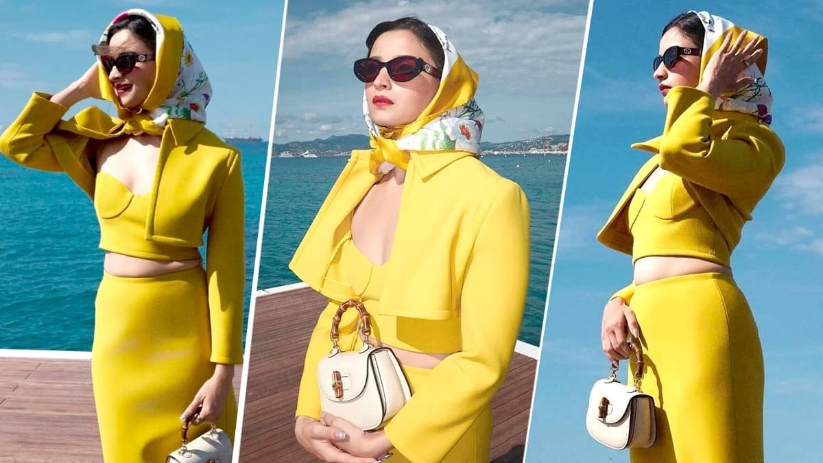 Alia Bhatt donned a lemon yellow Gucci co-ord set, which included a sleek pencil skirt, a matching cropped bustier, and a tailored cropped jacket at Cannes Film Festival 2025.