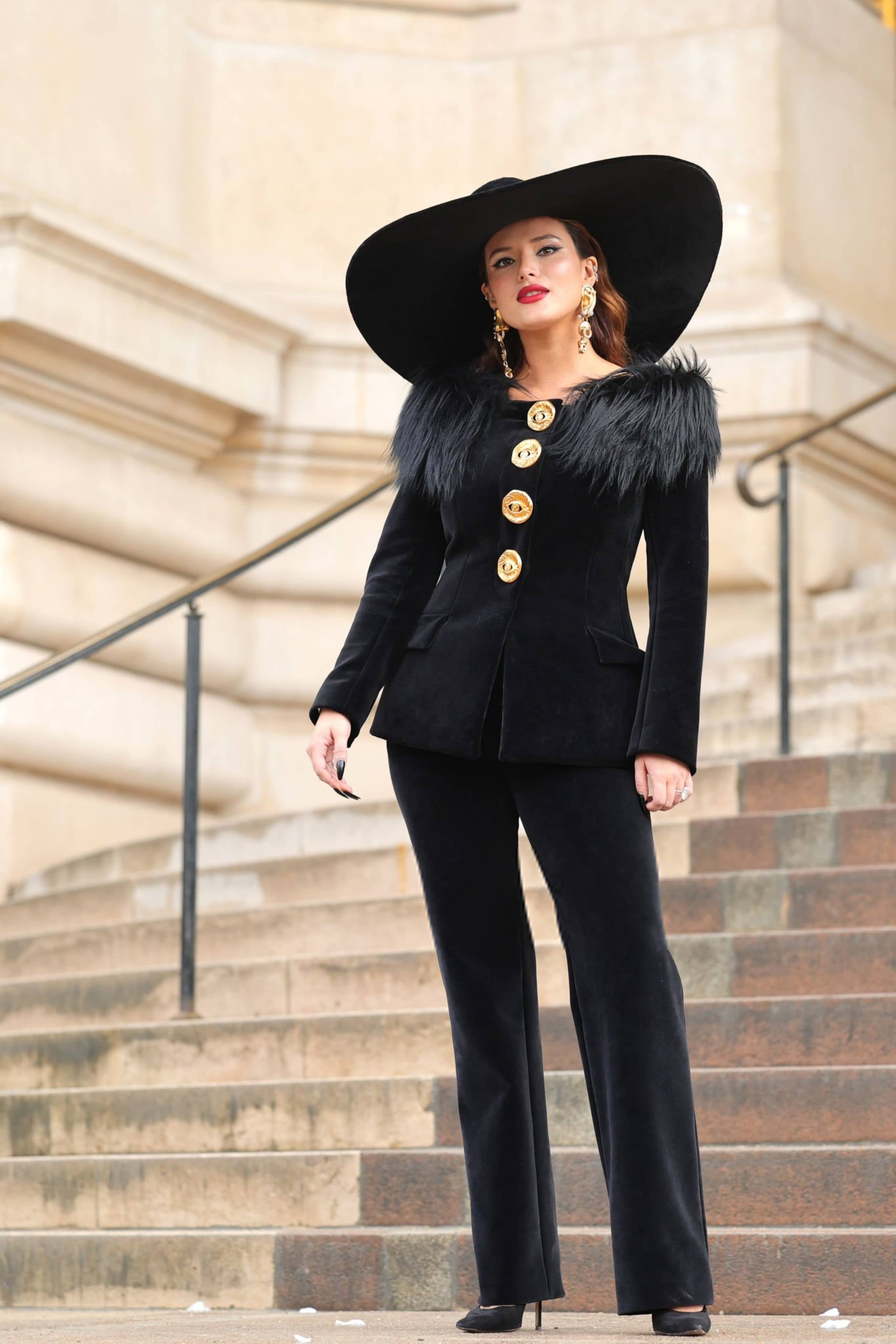 Bella Thorne's Paris Fashion Week look saw her step out in an all-velvet fitted pantsuit. The Gatsby-esque ensemble carried statement foiled buttons and statement feathered shoulders.