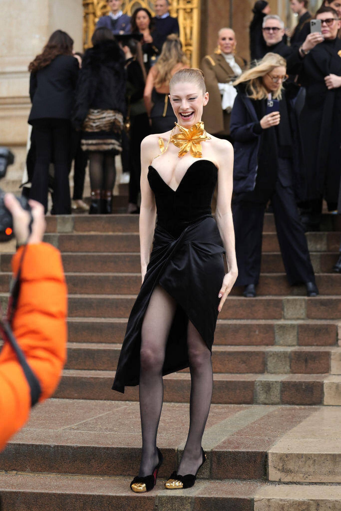 The neckpiece was a statement gold-tinted flower which appeared to be in bloom on her neck, adding an edgy yet feminine touch to the look, making it a standout.