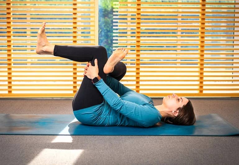 Lie on your back, cross one ankle over the opposite knee and draw your legs toward your chest. This intermediate pose offers a deep stretch for the lower back, glutes and outer hip muscles.