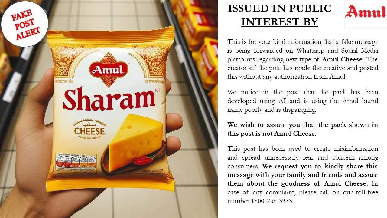 It further stated, “We notice in the post that the pack has been developed using AI and is using the Amul brand name poorly and is disparaging. We wish to assure you that the pack shown in this post is not Amul Cheese. This post has been used to create misinformation and spread unnecessary fear and concern among consumers.”