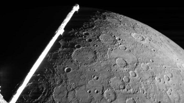 The BepiColombo spacecraft made its second closest approach to Mercury on June 23. Launched on October 20, 2018, the spacecraft skimmed over Mercury's surface at 3:14 p.m. (IST) and was just 200 kilometres above the planet's surface. Earlier today, the European Space Agency (ESA) shared a picture captured by the Mercury Transfer Module’s Monitoring Camera 2 from a distance of 920 kilometres, five minutes after the closest approach.