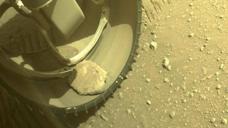 The Perseverance Rover of the National Aeronautics and Space Administration (NASA) rolling on the surface of Mars has picked up a rock in one of its six wheels.