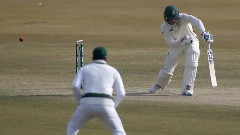 Rassie van der Dussen (48) was beaten by Hasan’s late swing off the third ball of the day and was clean bowled before Faf du Plessis (5) was trapped leg before wicket off a delivery which kept a bit low.