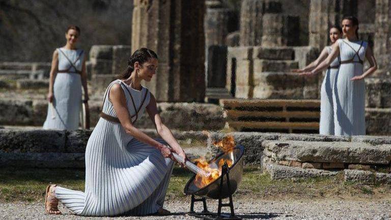 The ceremonial part of Thursday's flame-lighting was held with customary mock-archaic splendor: Young men and women dressed in pleated robes, a prayer to Apollo — the ancient Greek god of light — and dancing to flutes and drums under a splendid blue sky as blackbirds sang.