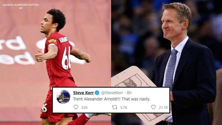 Steve Kerr, who is a known Liverpool fan, tweeted about Trent Alexander-Arnold after the right-back's inch-perfect free-kick. The Warriors head coach has tweeted in support of Liverpool multiple times and has even admitted to them being a source of inspiration for him. One of Kerr's tweets from May 2019 saw him tweet about the Liverpool anthem, 'You'll Never Walk Alone' in all caps after they defeated Barcelona 4-0 during the Champions League semi-final that year. During an interview with NBC Sports Bay Area last October, Kerr had revealed that he loves Liverpool for their teamwork, which is similar to the teamwork in basketball. Kerr had also revealed he loves how the team attacks, and also enjoys watching their manager, Jurgen Klopp.