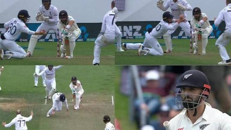 During the second day of the Wellington Test between New Zealand and England, Ollie Pope, who was positioned at silly point, pulled off an incredible one-handed catch from a close range. This came after England had declared on 435/8, with Joe Root finishing at an unbeaten 153, while Harry Brook could only add two runs to his Day 1 score and fell on 186.