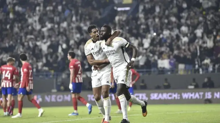 Antonio Rudiger, right, celebrates scoring their first goal with Jude Bellingham during the Semi Final of Spanish Super Cup match between Real Madrid and Atletico Madrid at Al Awal Park Stadium | Image: