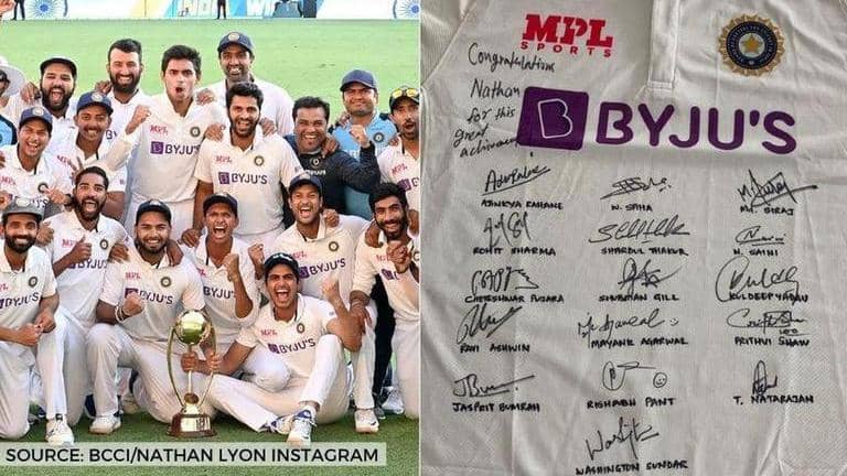 Australian spinner Nathan Lyon shared the jersey he received from Indian stand-in skipper Ajinkya Rahane, which features the signatures of the Indian team.