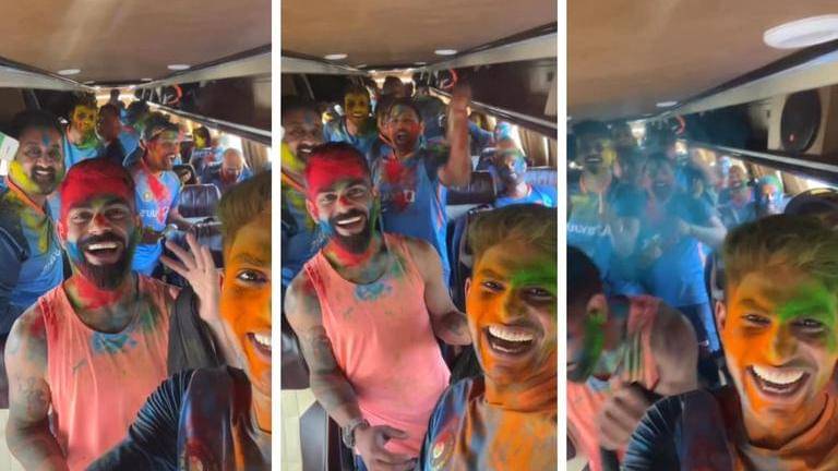 Indian players on Tuesday celebrated Holi ahead of the fourth and final Test match against Australia in Ahmedabad. In a video shared by opener Shubman Gill, the players were seen celebrating the festival of colours in the team bus. They were all painted in colours and were seen in cheerful moods. In the video, India captain Rohit Sharma could be seen throwing colours on Virat Kohli with the latter dancing to Holi songs.