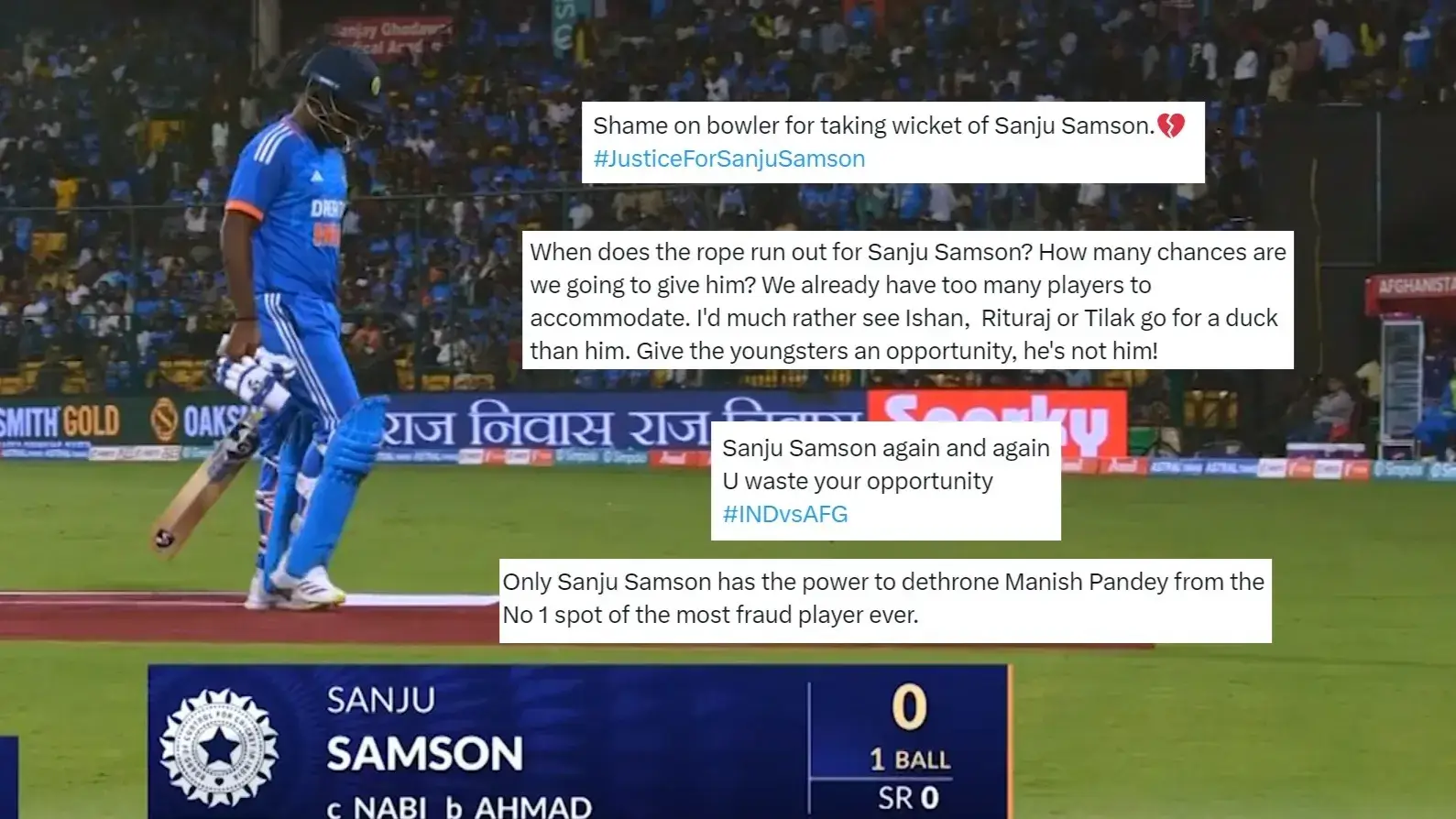 Fans are trolling wicket-keeper Sanju Samson over his performance in the third and final T20I. Samson was dismissed for a golden duck by Fareed Ahmad. Samson had come into the playing XI in place of Jitesh Sharma. This is the last T20I match for India before the T20 World Cup 2024 in June.
