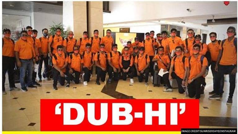Sunrisers Hyderabad players strike a pose after reaching Dubai ahead of IPL 2020
